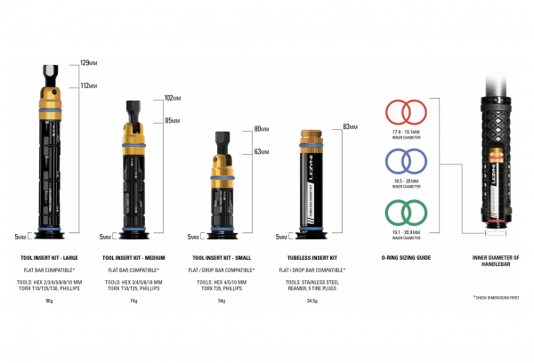 Le multi-outils, Tool Insert Kit, est construit en aluminium usiné léger et durable et comprend des embouts en acier trempé. Le kit est facilement accessible pour des réparations rapides et est livré avec cinq (petits), huit (moyens) ou 11 (grands) outils différents.