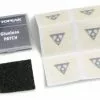 Le kit de rustines VP-1C comprend 6 rustines fines et fléxibles avec des bords effilés pour adhérer au profil de la chambre à air. Chaque kit est packagé dans une petite boite en plastique avec du papier de verre pour nettoyer la chambre et une notice.