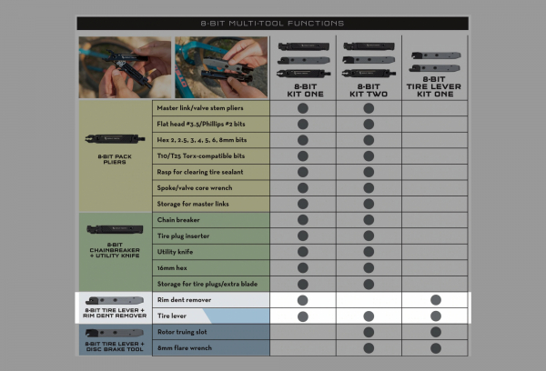 - 8-Bit Tire Lever + Rim Dent Remover Multi-tool (2 fonctions). Un dĂ©monte-pneu en plastique, fin et ergonomique, se trouve Ă l’opposĂ© d’un dĂ©bosseleur de jante en aluminium usinĂ©. Le dĂ©monte-pneu fonctionne avec tous les pneus (avec ou sans chambre Ă air), tandis que le dĂ©bosseleur de jante est compatible avec toutes les jantes mĂ©talliques.
