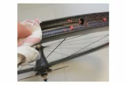 - Grâce à sa haute viscosité, le Carogna s’applique facilement, avec une brosse, sur la surface de collage de la jante. De couleur rouge, on voit clairement où on l’a appliqué.