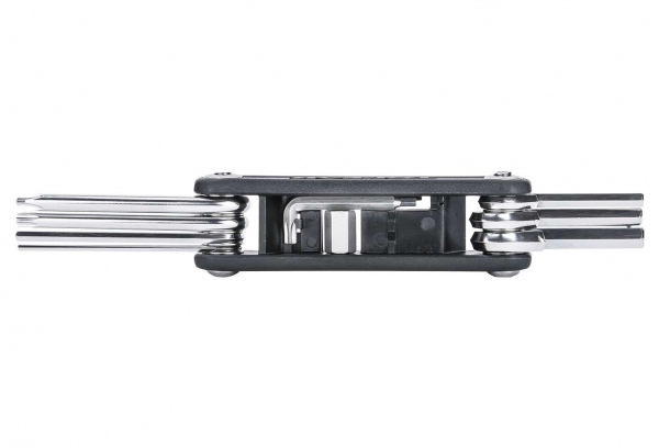Outil de pliage 11 fonctions qui peut facilement survenir à la plupart des réparations. Parfait pour le cyclisme de tous les jours. Inclus une clé auto-agrippante de type T20 / 2.5mm en L et 8mm
