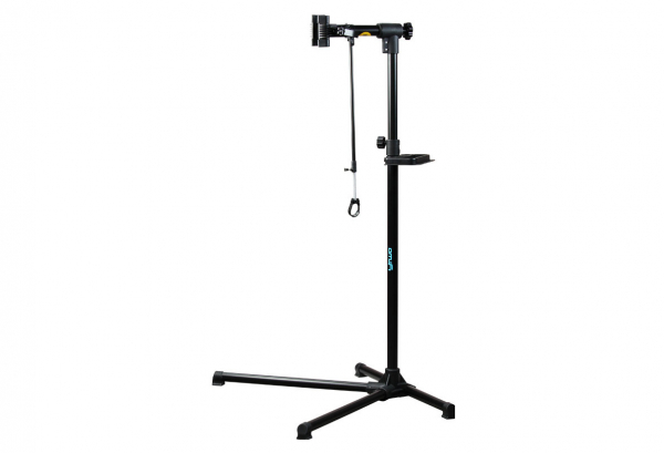 Pied d’atelier YTWO portable en acier/aluminium avec une large mâchoire réglable et verrouillage en rotation (quick release), avec mors en caoutchouc. Le vélo est suffisamment déporté du mat du pied pour que l’on puisse actionner le pédalier librement, idéal pour régler une transmission. L’empattement des pieds de 130 cm offre une stabilité maximale lors des réparation.