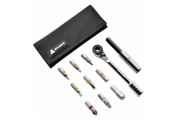 RocknRoll contient une mini-clé à cliquet, une tige de rallonge et un kit de 9 embouts. La clé à cliquet est peut-être de petite taille, mais suffisamment solide pour supporter un couple de serrage de 60 NM. Les embouts d’outil sont fabriqués à partir d’acier allié S2 de première qualité pour une résistance exceptionnelle et sont usinés CNC pour un engagement de précision. Il y a 7 embouts BTR (2 mm / 2,5 mm / 3 mm / 4 mm / 5 mm / 6 mm / 8 mm), un embout Torx (T25) et un embout tournevis Philips (PH2) dans le kit. Deux poches supplémentaires pour ranger une attache rapide (Quick Link) supplémentaire.