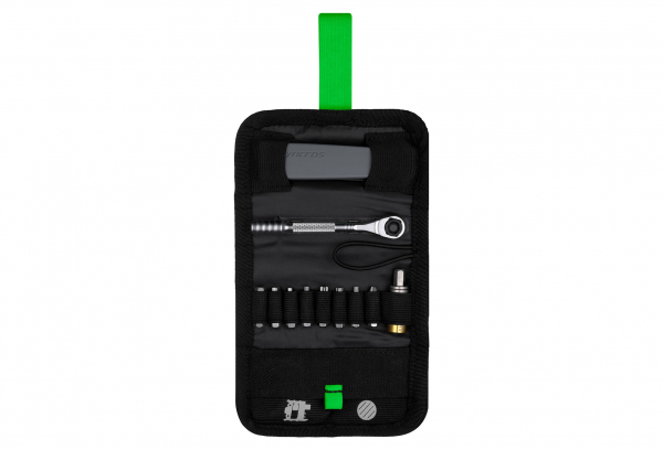 Le kit multi-outils de trail Syncros Guide comprend un tournevis à cliquet avec 9 embouts et un adaptateur de couple de serrage 5 Nm, un dérive-chaîne, des démonte-pneus, un kit de patchs autocollants et une boucle porte-clé, le tout ingénieusement regroupé dans une poche à outils simple mais sécurisée. Il s’adapte à un maillot ou à un sac à dos.